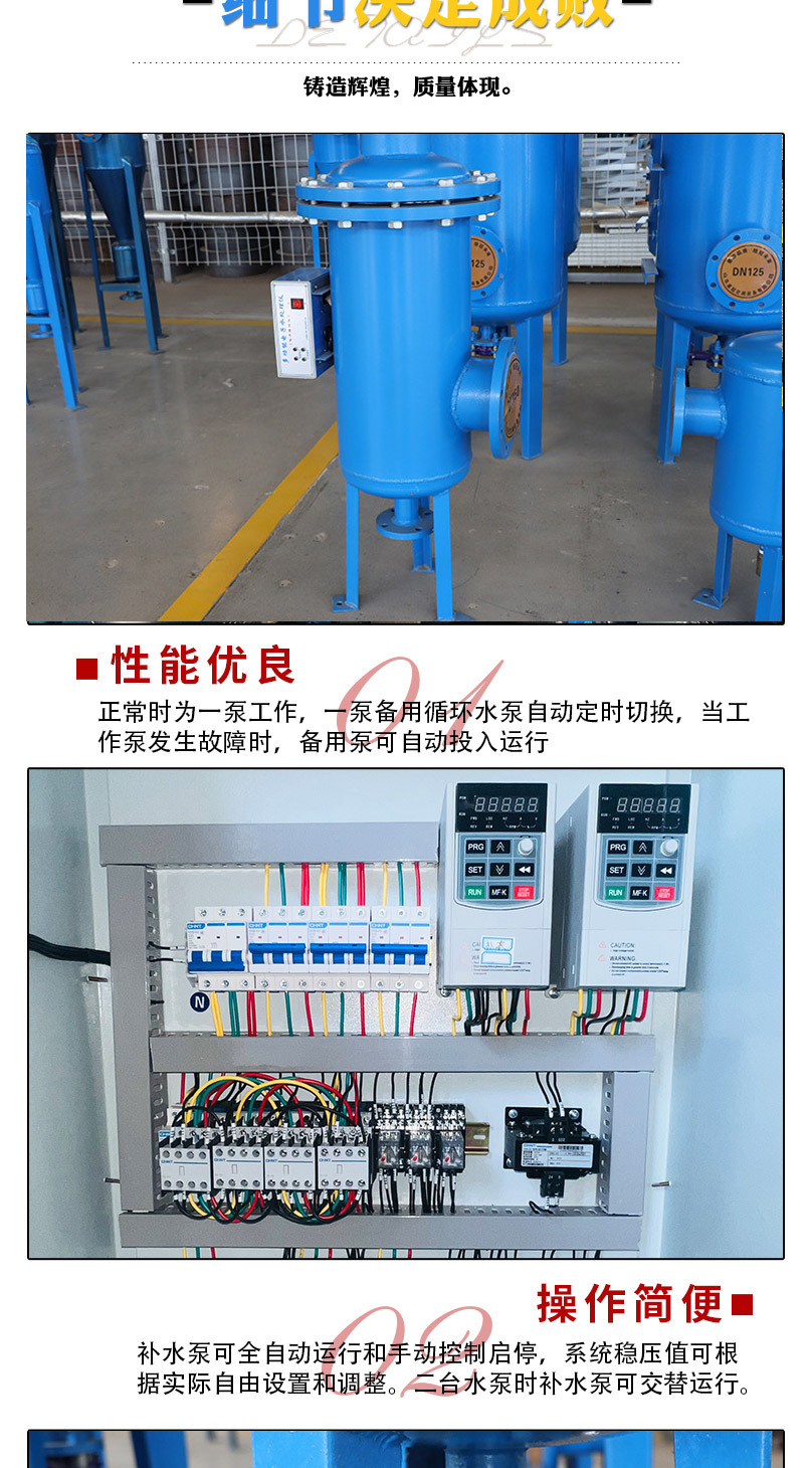 物化法全程水處理器是用于循環(huán)水處理的實用新型產品,它通過對水系統(tǒng)的綜合處理,徹底解決以往加藥方法產生的懸浮物遺留問題和物理處理方法效果不明顯問題,可有效防止水系統(tǒng)經常出現的結垢、腐蝕、生物粘泥、懸浮物堵塞問題,成為現今最有效的循環(huán)水處理設備。